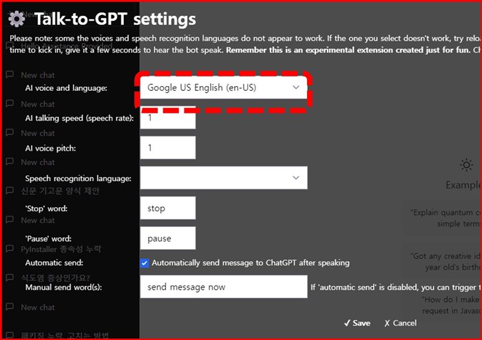 4. AI Voice and languge 변경(Google US English(en-US) 언어변경 및 저장
